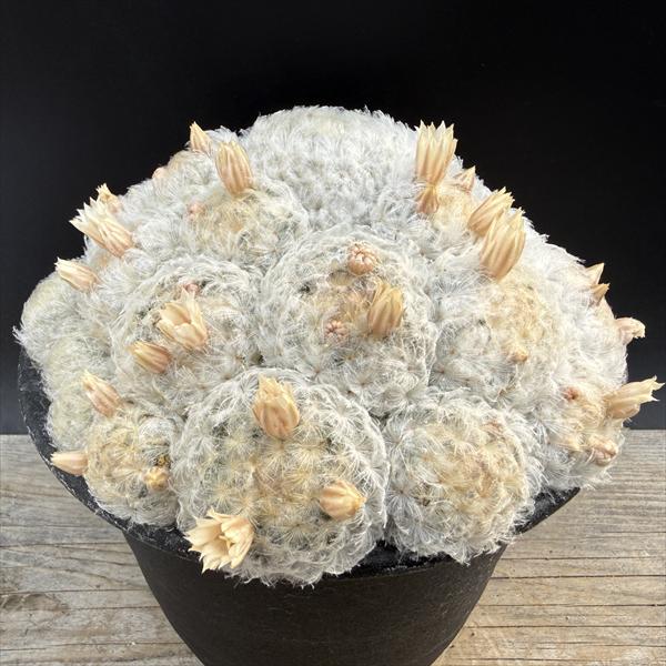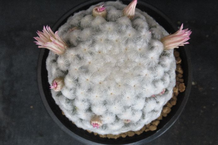 サボテン科マミラリア属で海外ではフェザーカクタス(直訳すると羽毛サボテン)という愛称で呼ばれています。その呼び名の通り、株の表面は羽毛のような白くて柔らかい棘にびっしりと覆われています。構造上「棘」になるので、こちらの記事では「棘」と書かせていただくのですが、その棘は触っても全く痛くないため、撫でて癒されることもできます。棘の下はマミラリア属特有のイボがぎっしりと並んでいます。
